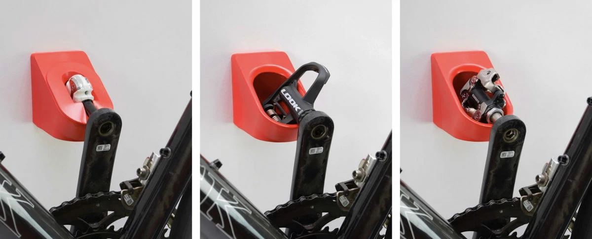 Diskret vægophæng hvor cyklen hænger i en pedal.