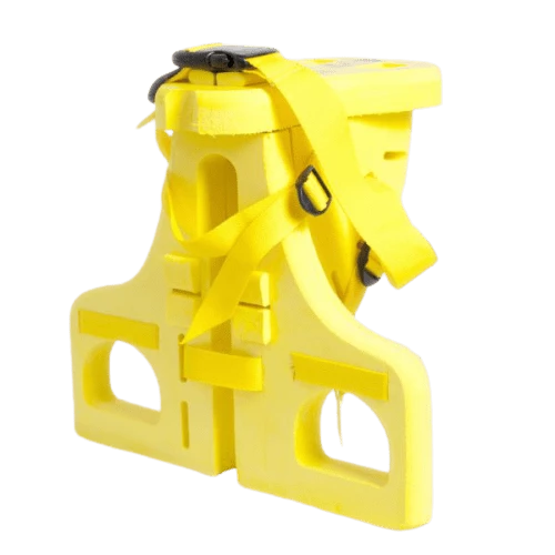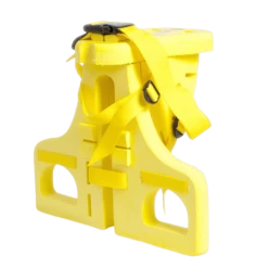 Barnet kan spændes fast på stolen med en strop henover skødet og en til hvert ben.