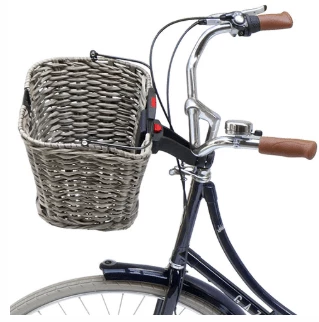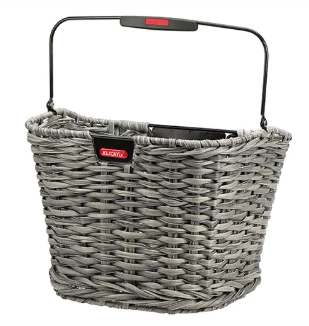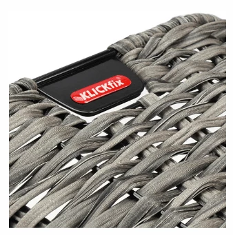 Smuk flettet håndtagskurv fra KLICKfix lavet i vejrfaste plastremme, der gør kurven modstandsdygtig overfor regn, blæst og sollys.